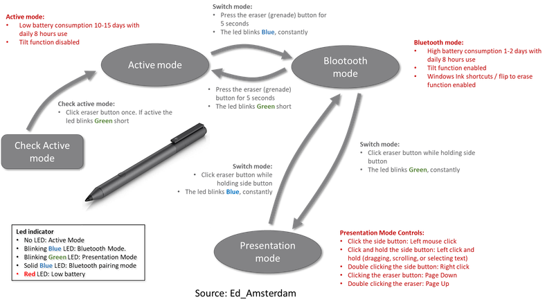 For anyone who's struggling the HP Tilt Pen I made a user manual, missing from HP. It describes how to check the battery status and how to switch from Active Mode to Bluetooth mode to Presentation mode and back. Hope its useful!