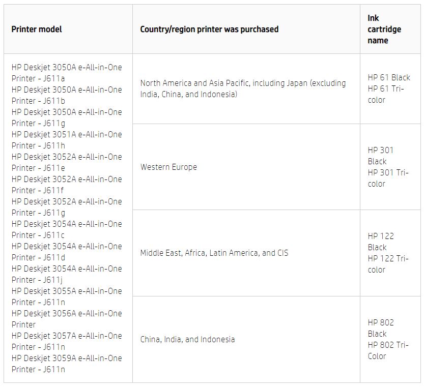 I have a HP Deskjet 3050A All-in-One Printer J611a, which I purchased in Belgium with HP 301 cartridges. I currently live in the US (NY) where I couldn't find those cartridges. I saw that cartridges HP 61 black & tricolore were also compatible with my printer, but when I tried to install them I received the alert that "both cartridges are not compatible with this printer". After some research on the web, I figured out it has something to do with the settings for the region, and that we would need a regionalization reset to solve the problem.