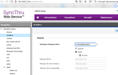 I think I did some bad setting entries in my setup regarding network and security (web access SyncThruWebService) and now I can't access to my printer setup by the web browser nor print (it appears offline).