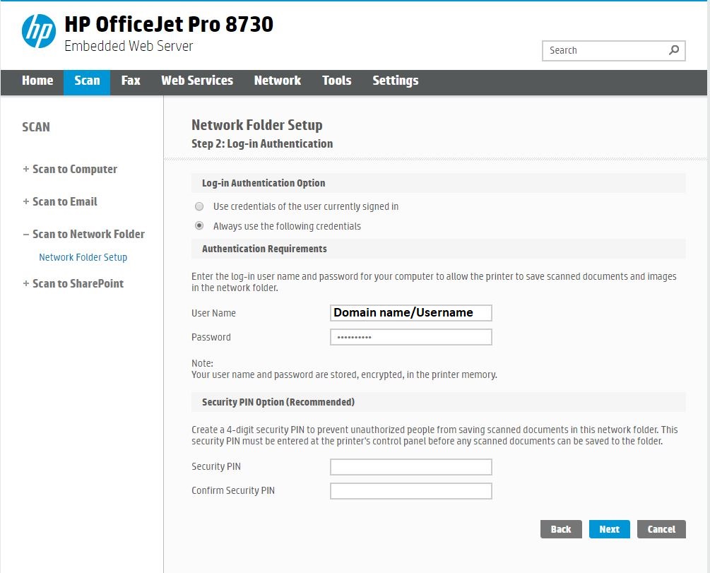 What it IS REFUSING TO do is to accept the login details so that it scans -as PDF - onto a network folder.
