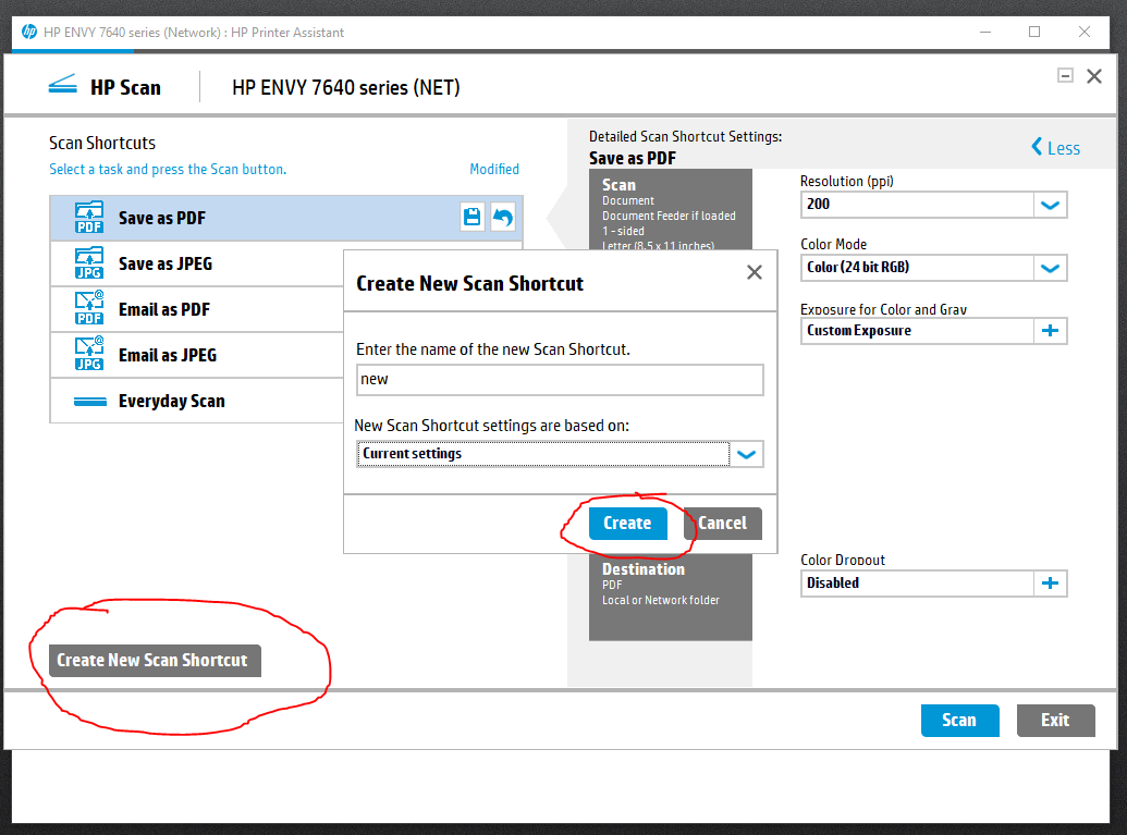 Is there a way to save exposure settings in HP Scan software? I know tha I can create a new scan shortcut and save many settings in it. However, I haven't found a way to save to the Brightness, Contrast or Midtone settings. I'm scanning several hundred documents with similar properties and at present I need to change the exposure for each individual scan unless I can find a way to set those as a default.